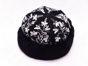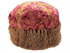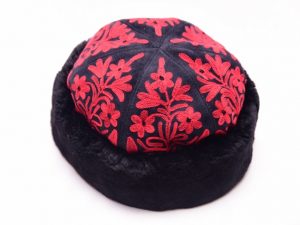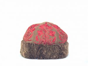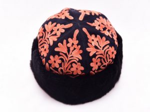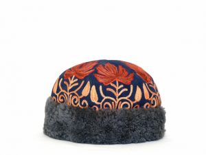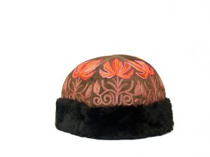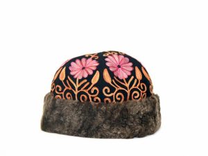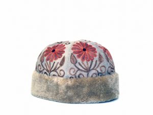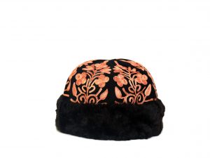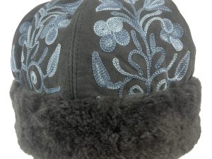 Stylish suede embroidered caps with lamb wool trimming.