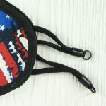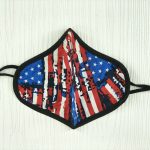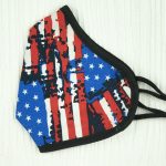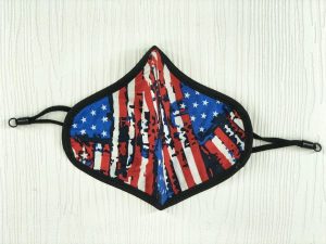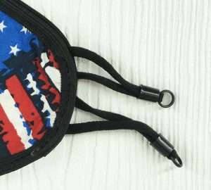 US flag print reusable, washable and reversible 100% cotton mask. Elastic ear loop with length adjuster. Completely covers face without slipping. Very comfortable and keeps you protected because it covers well and stays in place.