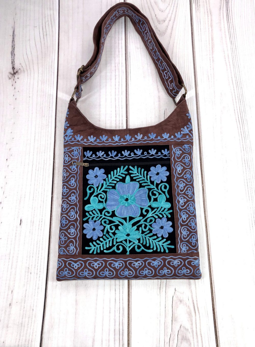 One zippered pocket inside. Two full size zippered pockets outside, on each side of the bag. Adjustable straps.