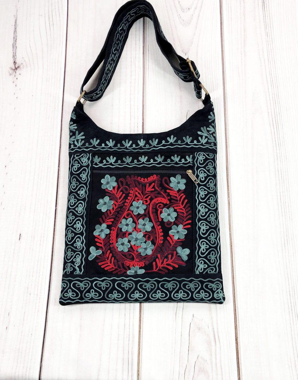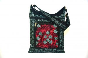 One zippered pocket inside. Two full size zippered pockets outside, on each side of the bag. Adjustable straps.